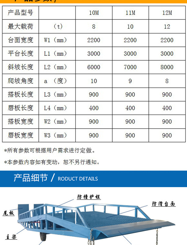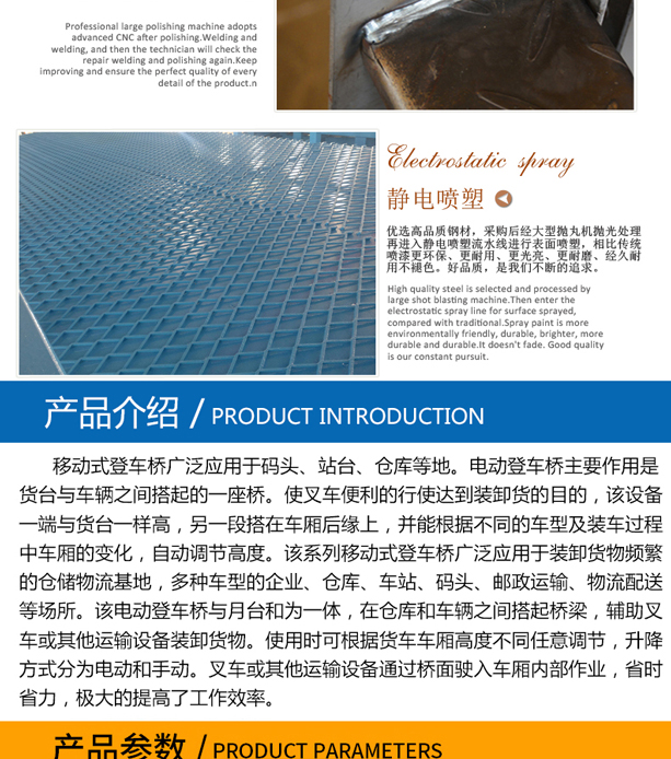 该系列固定式登车桥广泛应用于装卸货物频繁的仓储物流基地,多种车型的企业、仓库、车站、码头、邮政运输、物流配送等场所。该电动登车桥与月台和为一体,在仓库和车辆之间搭起桥梁,辅助叉车或其他运输设备装卸货物。使用时可根据货车车厢高度不同任意调节,中欧(中国)方式分为电动和手动。叉车或其他运输设备通过桥面驶入车厢内部作业,省时省力,极大的提高了工作效率。